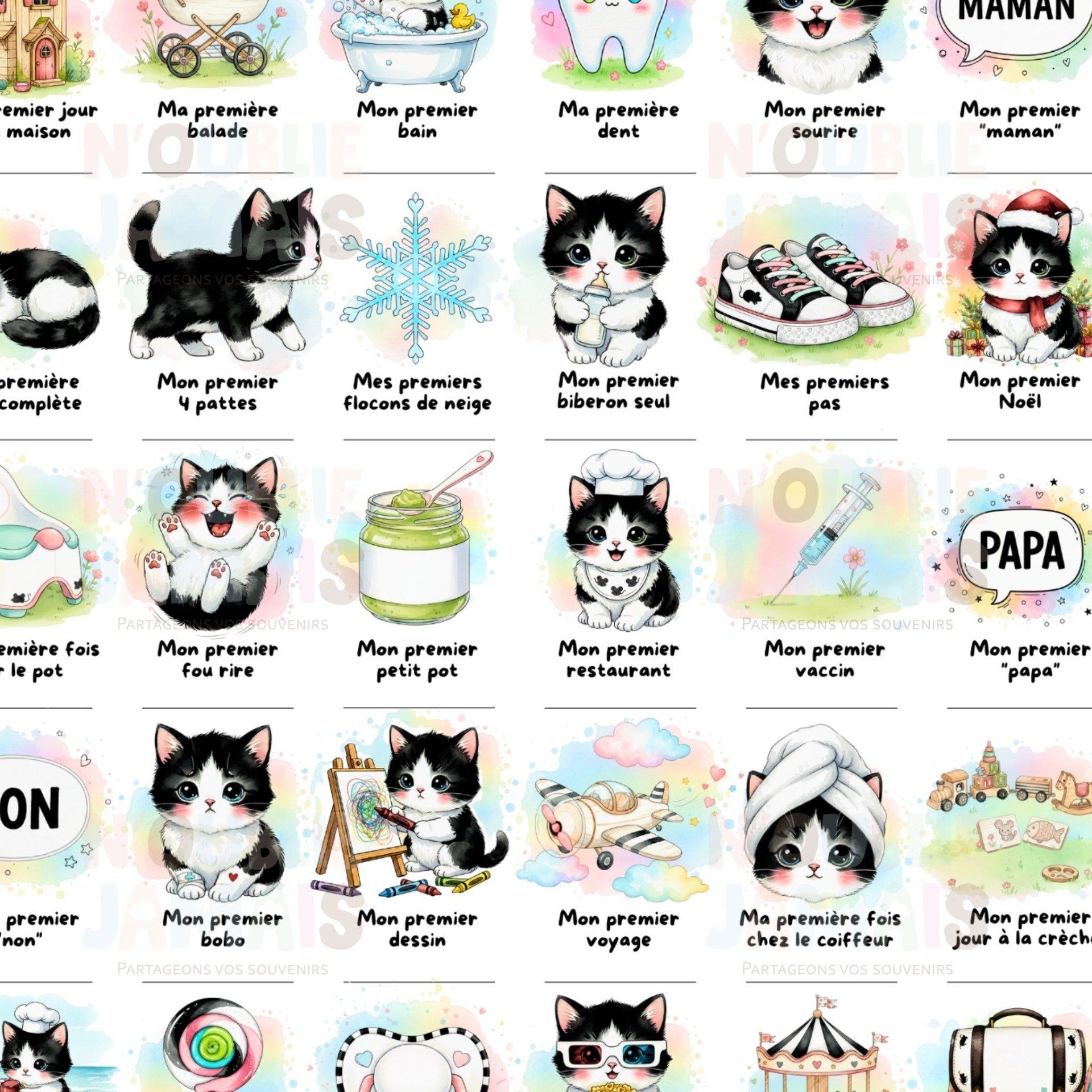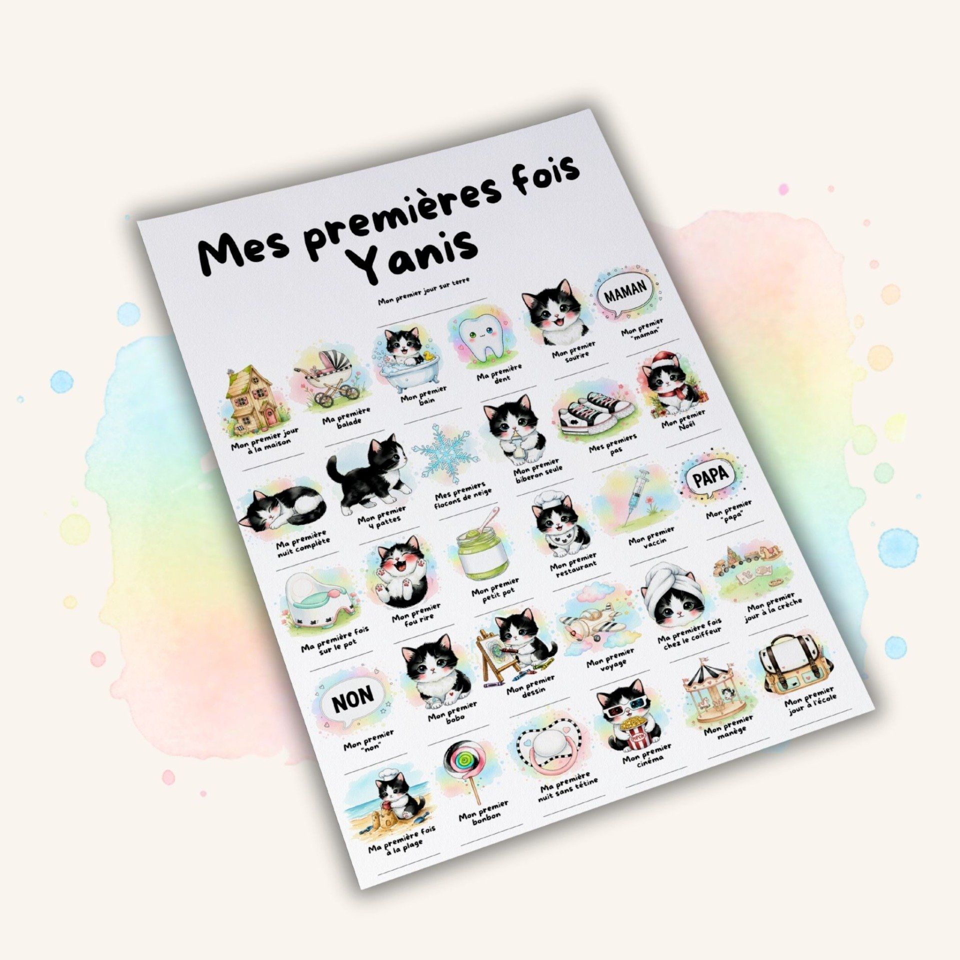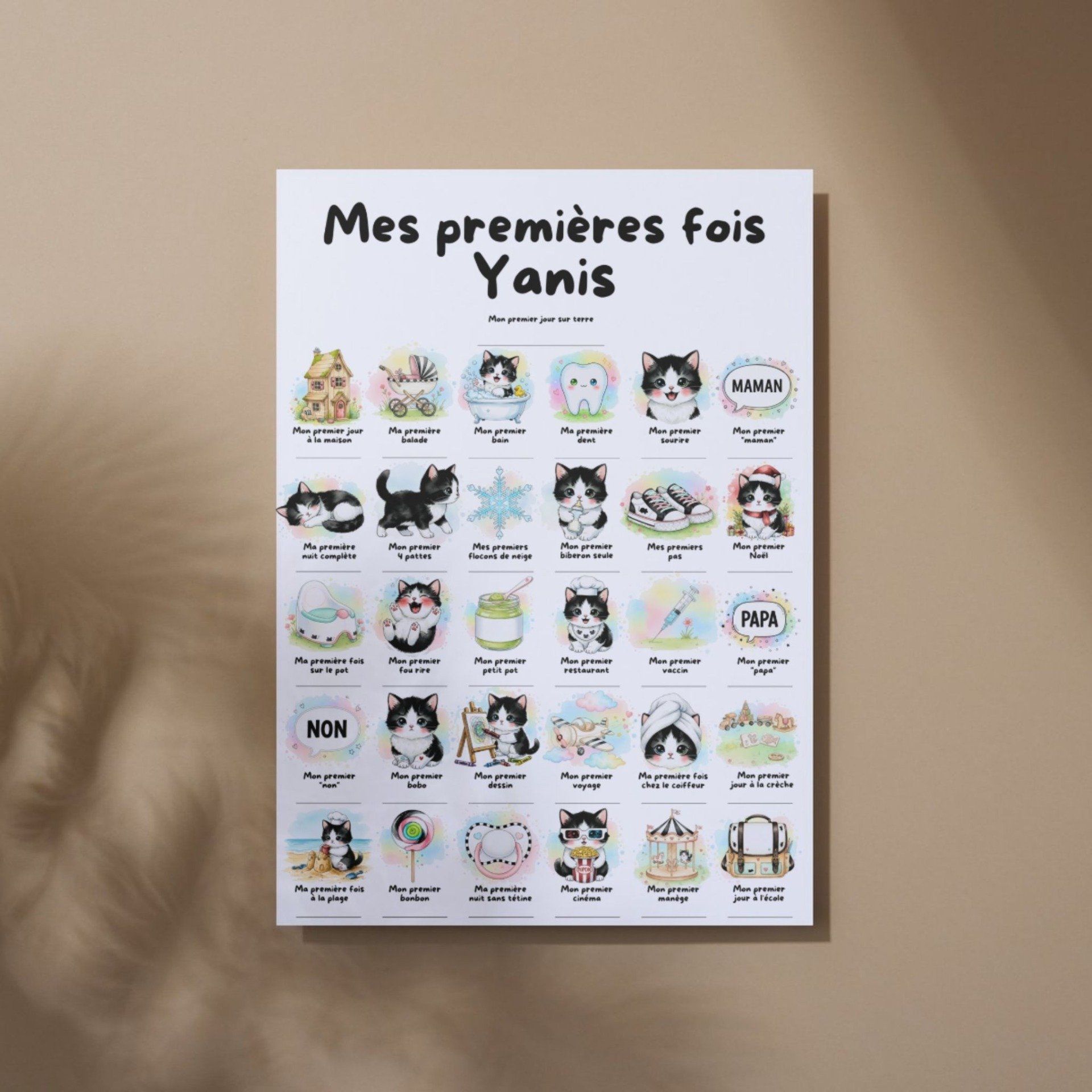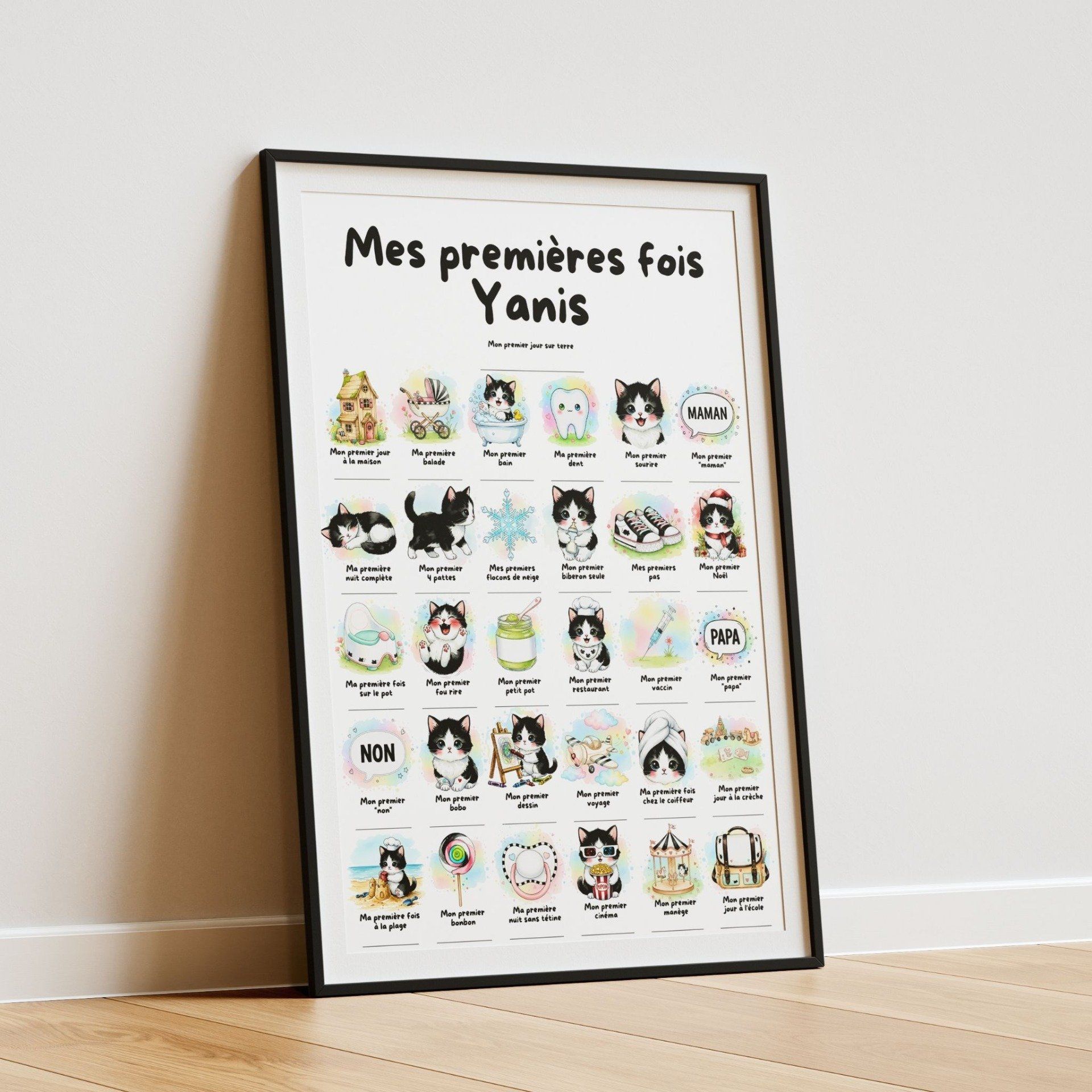 Immortalisez chaque étape de bébé avec notre affiche A3 "Mes Premières Fois" thème chat noir & blanc. Création française, imaginée et imprimée à Aix-en-Provence, à personnaliser avec son prénom. Le souvenir parfait à compléter au stylo ou avec un tampon.