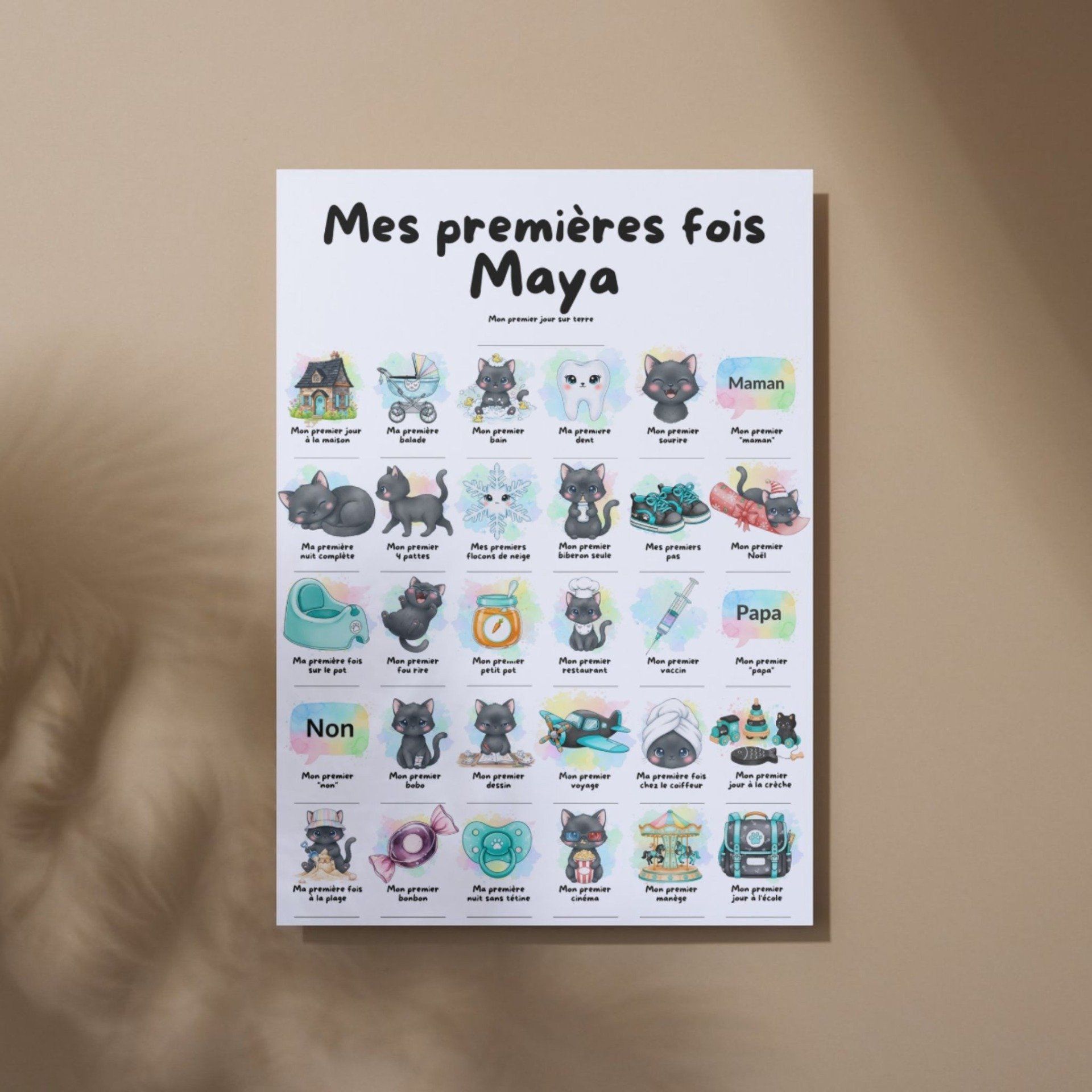 Immortalisez chaque étape de bébé avec notre affiche A3 "Mes Premières Fois" thème chat noir. Création française, imaginée et imprimée à Aix-en-Provence, à personnaliser avec son prénom. Le souvenir parfait à compléter au stylo ou avec un tampon dateur.