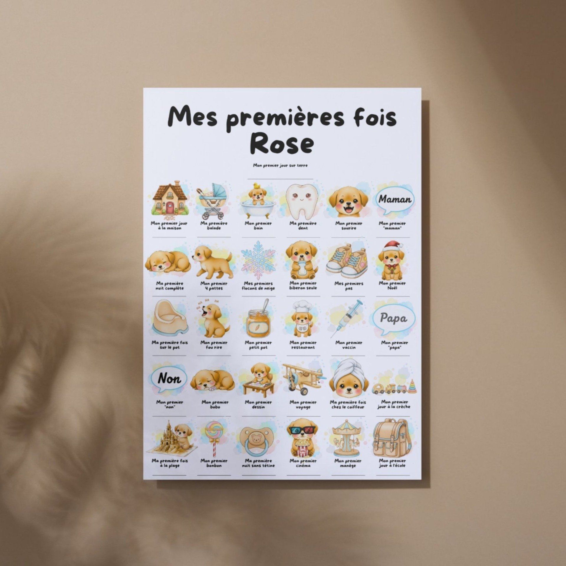 Immortalisez chaque étape de bébé avec notre affiche A3 "Mes Premières Fois" thème labrador. Création française, imaginée et imprimée à Aix-en-Provence, à personnaliser avec son prénom. Le souvenir parfait à compléter au stylo ou avec un tampon dateur.