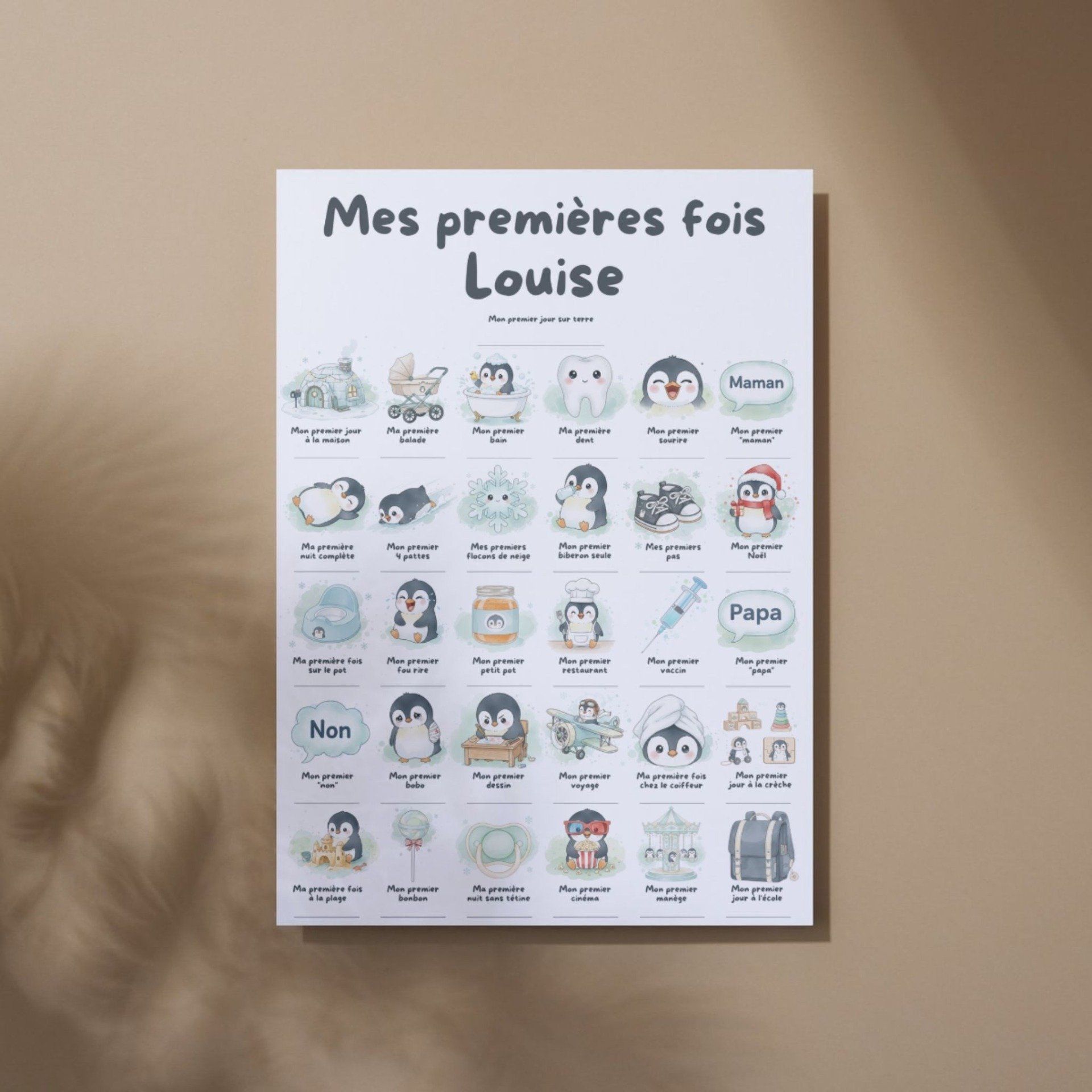 Immortalisez chaque étape de bébé avec notre affiche A3 "Mes Premières Fois" thème pingouin. Création française, imaginée et imprimée à Aix-en-Provence, à personnaliser avec son prénom. Le souvenir parfait à compléter au stylo ou avec un tampon dateur.